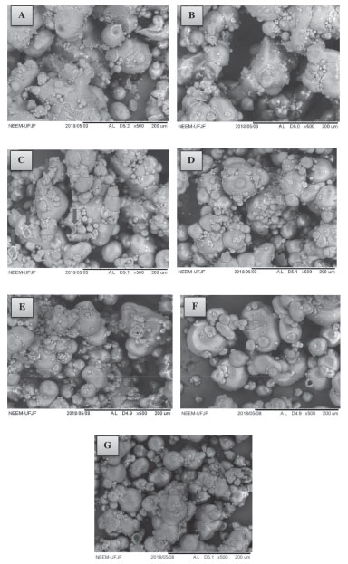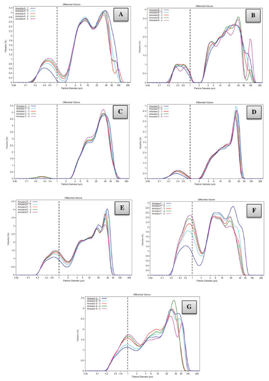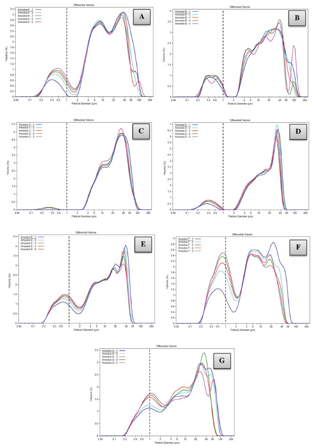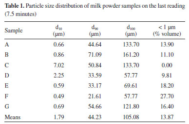EXPERIMENTAL Seven samples of whole milk powder from different brands were analyzed (A, B, C D, E, F, G codification).The powders morphological analyses were conduct through images of scanning electron microscopy - SEM (x500) (Hitachi TM 3000, Hitachi Ltd., Tokyo, Japan). Particle size distribution was analyzed by laser diffraction (Beckman Coulter LS 13 320, Miami, FL, EUA) coupled to the aqueous liquid module (Beckman Coulter, Miami, FL, EUA). Powders form samples, without rehydration, were slowly added to the analysis module, filled with room temperature water at 25 °C, until reading signal levels of 50% + or - 5% were achieved on the photodetectors PIDS (Polarization Intensity Differential Scattering System). Data were collected on the region of 0.04 to 2.000 µm every 90 seconds over 5 different times (1.5; 3.0; 4.5; 6.0; and 7.5 minutes). Results were calculated with refractive indices of 1.332 for the dispersant (water) and 1.57 for the casein micelles, and 1.47 for the fat globules aiming at the observation of total solubility.12,13 Data were represented by the percentage of occupied volume by the particles as a function of their size. Statistical analyses were conducted with the equipment software.