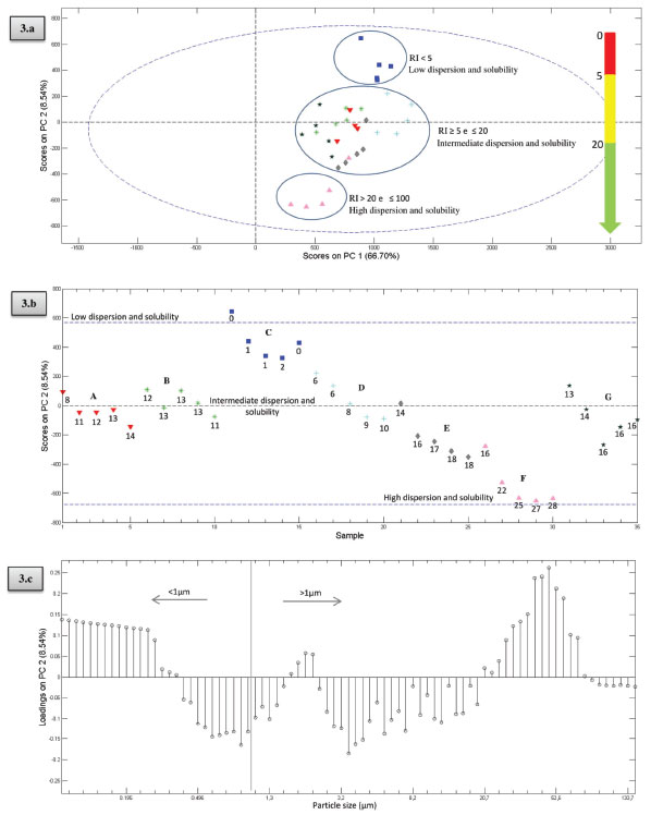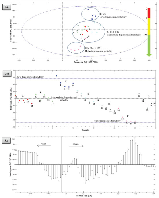 Figure 3.a shows an 66.7% of accumulation of responses in PC1 with a small range of variation inversely to the accumulation of responses in PC2 (8.54%), in which there is a bigger range of variation. Because of this bigger variation and to avoid the agglomeration of results, Figure 3.b shows the samples division with their respective rehydration indexes and possible classification in low, intermediate and high properties of dispersion and solubility. Ergo, the behavioral profile of the samples was achieved through principal component analysis. Three groups were obtained with the division based on the quantity of particles under 1 µm. This value was chosen based on the characteristics of the curve obtained by the particle size distribution analysis. The curve is classified as bimodal, showing two modes with interstice close to <1 µm and >1 µm. The analysis of this result shows a mix of two distinctive population of particles, one being the caseins and the other being fat and other non-hydrated particles. All in all, it was possible to create a rehydration index in which powders with RI < 5 are the ones with less condition to recover their original conformation after being rehydrated (low dispersion and solubility); RI ≥ 5 and ≤ 20 represents powders with intermediate condition to recover their original conformation after being rehydrated (medium dispersion and solubility); and RI > 20 belongs to the ones with higher condition to recover their original conformation after being rehydrated (high dispersion and solubility). It is worth mentioning that parameters as mixing equipment design, conditions of operation such as agitation and temperature, and chemical composition of the powder affect the rehydration of dairy powders.6 Thus, the suggestion of a rehydration index may help the choice of the best powder according to the application. For example, products with RI > 20 should be chosen for direct consumption because the original structure can be achieved more efficiently. On the other hand, powders with RI < 5 or RI ≥ 5 and ≤ 20 could be used as ingredients for the production of other foods (e.g. dairy products, bakery, confectionery, and meat products) without compromising the final characteristics because of its direct application with no rehydration. Therefore, this work stipulates an efficient rehydration index to determine powders dispersion. At last, Figure 3.c shows the contribution of each resolution channel to the rehydration index intensity. Powders with higher amount of small particles (close to 0.195 µm) presented an increase in RI intensity, while powders with bigger particles (close to 52.6 µm) had a decrease in RI intensity. The particle size analysis investigated on this work is the result of the combination of 80 resolution channels. Hence, this technique is more accurate and faster, from the analytical point of view, than the official dispersion analysis which comes from a single result. Thereby, the determination of RI through particle size may replace or complement the original analysis of powders dispersion although it is necessary to use an analytical device. The standard dispersibility analysis is manually intense, time consuming and cannot be automated or easily online configured. Thus, alternative techniques have been studied using laser diffraction, sifting,8 particle size distribution6 and even the development of a device9 to facilitate the determination of dispersibility.