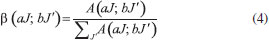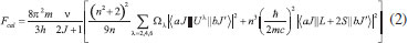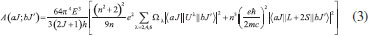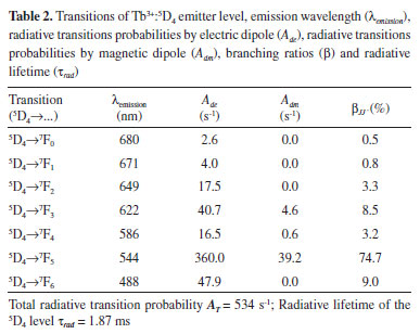In order to analyze the radiative properties of the Tb3+ ions, such as the total radiative transition rate between ions, luminescence branching ratios and radiative lifetimes, the well-established Judd-Ofelt (JO)24,25 theory was applied. The Ωλ intensity parameters (λ = 2, 4, 6) are extracted by the experimental and calculated oscillator strengths for each ground state absorption transition. The experimental oscillator strength is obtained from the absorption spectrum according to the following equation (1): ![]() The oscillator strength calculated contains the reduce matrix element of the given transition, and the Ωλ parameters, and is given by the equation (2): ![]() In these equations, m is the electron mass, c is the speed of light, e is the electron charge, N is the number of doping ions per cm3, ∫α(ν) is the area of the absorption band, n is the refractive index, h is the Planck constant, ħ is the reduced Planck constant, ν is the transition frequency, and J is the ground state quantum number. The first term in parentheses of equation (2) accounts for the electric dipole contributions, where 〈aJ||Uλ||bJ'〉 are the reduced matrix elements of the tensor operator Uλ of rank λ, corresponding to transitions from 〈aJ| to |bJ'〉 to states. The matrix elements do not depend on the chemical environment and can be found in the literature.26 The second term corresponds to the magnetic dipole contributions, with L + 2S being the magnetic dipole operator. Once the intensity parameters are determined, they can be used to calculate the total radiative transition rate between two levels, a and b, which can be obtained through the following expression: ![]() In which is the average transition energy in cm-1 and J is the total angular momentum of the emitting level. The luminescence branching ratios and the radiative lifetime are given by: ![]() and ![]() respectively. The absorption spectrum obtained for a sample with 2.0Tb was used to obtain the Ωλ intensities parameters, where λ = 2, 4, 6 for the CaLiBO glass doped with Tb3+ ions. Table 1 presents the experimental and calculated oscillator strengths for the J → J´ absorption transitions from the ground 7F6 state to the excited levels, obtained using equations 1 and 2. The root-mean square (RMS) error for oscillator strengths was 1.8%. We determined the intensity parameters Ωλ for CaLiBO:Tb3+: Ω2 = 15.5 x 10-20 cm2, Ω4 = 1.90 x 10-20 cm2 and Ω6 = 3.69 x 10-20 cm2.