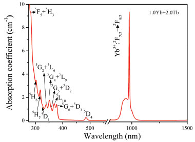 ![]() Figure 1. Room temperature representative ground state absorption spectrum of 1.0Yb+2.0Tb co-doped glass sample. The transitions from ground states 7F6 and 2F7/2 are indicated