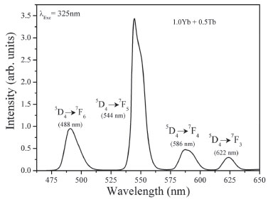 Luminescence The visible Stokes luminescence spectra were obtained after direct excitation into the 5D1 energy level of Tb3+ ions at 325 nm. Figure 2 shows the corresponding spectrum for the 1.0Yb+0.5Tb codoped glass. Regarding the line shape and wavelength positions, this spectrum is representative for the glasses with different Yb3+ doping concentrations. As observed, a dominant green emission band with a peak centered at approximately 544 nm was identified and assigned to the Tb3+:5D4→7F5 emitter level. The Tb3+:5D4→7F6,4,3 emitter levels were also identified with peak emission bands centered at 488, 586 and 622 nm, respectively.