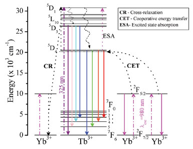 ![]() Figure 3. Energy level diagrams of Yb3+ and Tb3+ ions. The UC through cooperative energy transfer (CET), Yb3+-Tb3+ cross-relaxation (CR), and excited state absorption (ESA) processes are indicated by dotted lines. The non-radiative relaxation processes, excitation and emission transitions are indicated by dashed, dashed-dotted and solid lines, respectively