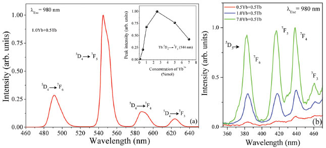 ![]() Figure 4. (a) Tb3+ UC luminescence spectrum in the visible region of the 1.0Yb+0.5Tb co-doped CaLiBO glass upon excitation at λExc=980 nm. The inset presents the dependence of the peak intensity with Yb3+ doping concentration of the emission band centered at 544 nm (Tb3+:5D4→7F5 emitter level) via the UC process. (b) UV-blue UC luminescence spectra for the samples xYb+0.5Tb with (x=0.5, 1.0, 7.0). The Tb3+:5D3→7FJ, J = 6, 5, 4, and 3 emitter levels are indicated, excitation at λExc=980 nm