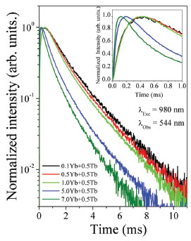 ![]() Figure 5. Kinetic response of Tb3+ UC luminescence for the samples xYb+0.5Tb with (x = 0.1, 0.5, 1.0, 5.0, 7.0) upon excitation at λExc = 980 nm, monitored at λObs = 544 nm (Tb3+:5D4→7F5 emitter level). The inset shows the responses at the first millisecond after the laser pulse