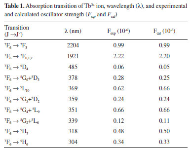 RESULTS AND DISCUSSION Absorption spectra and Judd-Ofelt analysis Figure 1 presents the absorption spectrum of 1.0Yb+2.0Tb codoped CaLiBO glass in the 250-1500 nm range. This spectrum is also representative for all the samples. The spectrum presents the typical Tb3+ bands in regards to line shapes and wavelengths. The electronic levels of Tb3+, excited by transitions from 7F6 ground state are indicated, as well as the 2F7/2→2F5/2 transition of Yb3+ at 980 nm. The absorption coefficient in the NIR referring to the 2F7/2→2F5/2 transition of Yb3+ (980 nm) as a function of the nominal Yb3+ concentration had a linear dependence, and it is an indication of the successful incorporation of Yb3+ ions, for the prepared glass samples (not shown here).