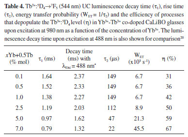 EXPERIMENTAL Synthesis of glasses A CaLiBO glass matrix (30CaO + 10Li2O + 60B2O3) (% mol) was prepared by the conventional melt-quenching method using high-purity CaCO3, Li2CO3, and B2O3; this glass was then doped with Tb4O7 and Yb2O3, at approximately 1200 ºC for 1 h. The set of CaLiBO glasses doped with Tb4O7 and Yb2O3 were prepared with the following compositions: (99.5-x)% CaLiBO + 0.5% Tb4O7 + x Yb2O3, with x = 0, 0.1, 0.5, 1, 2.5, 5, and 7 (% mol). The glasses were cut and polished into a plate shape with the following dimensions: 3 mm × 10 mm × 10 mm. Optical characterization Ground state absorption spectra for both sets of samples were obtained using a Perkin Elmer Lambda 900 spectrophotometer in the 250-2500 nm spectral range. The visible Stokes luminescence spectra were obtained using a He-Cd laser (Kimmon/IK5652R-G) at 325 nm as the excitation source. The luminescent signal was dispersed by a monochromator (0.3 m, Thermo Jarrel Ash/82497), detected by a photomultiplier tube (PMT) (Hamamatsu/R928), and amplified by a lock-in amplifier. The UC luminescence spectra were obtained using an InGaAs index-guided strained-layer diode laser (Coherent, 980 nm excitation wavelength) as the excitation source, and the same laser was employed for the excitation power dependent measurements. Tb3+:5D4→7F5 UC luminescence kinetic response measurements were performed using an optical parametrical oscillator (OPO) (Surelite SLOP/Continumm) pumped by the third harmonic (355 nm) of a Nd-YAG laser (Surelite SLII-10/Continumm, 10 Hz, 5 ns) to generate excitation at a wavelength of 980 nm. The signal was dispersed by the same single monochromator (0.3 m) and the Tb3+:5D4→7F5 UC luminescence decay curves were recorded using the PMT and a digital oscilloscope (TekTronix/TDS380) to estimate the Tb3+:5D4→7F5 UC luminescence rise and decay times. All spectroscopic measurements were obtained at room temperature.