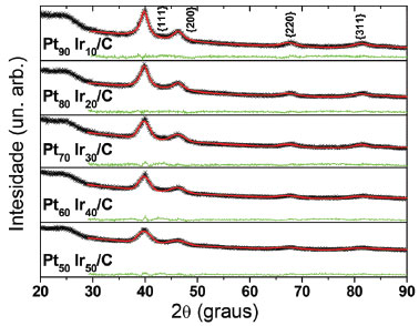 ![]() Figura 1. Padrões de difração de raios X experimentais (pontos) e calculados (linha vermelha) e suas diferenças (linha verde) para os eletrocatalisadores preparados pelo método de redução química