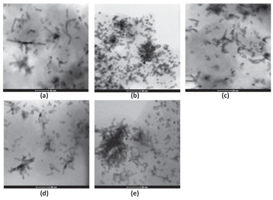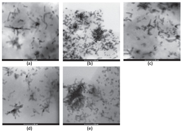![]() Figura 2. Micrografias eletrônicas de transmissão dos nanofios sintetizados: Pt0,9Ir0,1/C (a); Pt0,8Ir0,2/C (b); Pt0,7Ir0,3/C (c); Pt0,6Ir0,4/C (d); e Pt0,5Ir0,5/C (e).