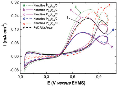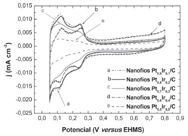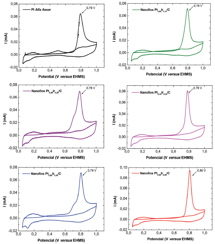 ![]() Figura 3. Voltamogramas cíclicos (segundo ciclo) realizados sobre os nanofios Pt0,9Ir0,1/C; Pt0,8Ir0,2/C; Pt0,7Ir0,3/C; Pt0,6Ir0,4/C; Pt0,5Ir0,5/C no eletrólito de suporte (H2SO4 0,5 mol L1) a ν = 20 mV s1.