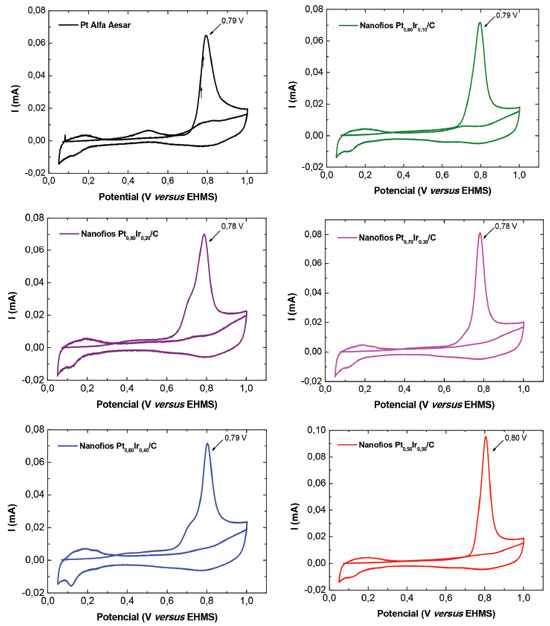 Foram observados picos redox típicos, associados à adsorção/dessorção de H2 que é formado pela oxidação do hidrogênio absorvido (varredura anódica) e redução de íons de H+ presentes na solução (varredura catódica) entre 0,05-0,3 V vs. EHMS. O eletrodo entre 0,3 e 0,7 V se comporta como idealmente polarizado apresentando apenas correntes capacitivas correspondentes à acomodação dos íons na dupla camada. Os nanofios Pt0,5-Ir0,5/C mostraram picos de adsorção/dessorção de hidrogênio bastante reduzidos, fato que pode afetar significativamente a atividade eletrocatalítica deste catalisador. Neste sentido, as medidas de DRX mostraram que este catalisador apresentou picos de difração com intensidades menores quando comparados com os outros nanofios. Este comportamento também pode ser atribuído ao recobrimento dos sítios ativos da platina pelo irídio, pois a platina pode ser reduzida numa velocidade maior que o irídio. Desorção oxidativa de CO A oxidação de CO a platina obedece ao modelo cinético de Langmuir-Hinshelwood, em que o mesmo sítio ativo é disputado pelo O2 e CO, diminuindo a taxa de reação quando a quantidade de CO é aumentada. Quando um segundo metal é adicionado à platina geram dois sítios ativos fazendo com que seja minimizado esse efeito competitivo, pois o CO é oxidado no sítio da platina e o O2 é adsorvido de forma dissociada no sítio do segundo metal.28 A Figura 4 apresenta a remoção de CO das nanopartículas do catalisador comercial (Pt/C, Alfa Aesar). O início da oxidação do CO, bem como o potencial de pico de remoção (≈ 0,8 V) estão de acordo com estudos prévios observados na literatura em meio de H2SO4.29 Para os nanofios Pt0,8Ir0,2/C, Pt0,7Ir0,3/C e Pt0,6Ir0,4/C o início de oxidação de CO teve um deslocamento de aproximadamente 100 mV para valores mais negativos quando comparados à Pt/C comercial. O pico máximo nestes catalisadores é também deslocado em 10 mV para valores mais negativos do que a Pt/C. O catalisador Pt0.5Ir0.5/C apresenta pico de oxidação de CO em aproximadamente 0,8 V, valor semelhante ao apresentado pelo catalisador comercial. Este comportamento pode se dever à quantidade elevada de Ir presente no catalisador, diminuindo assim a quantidade de sítios ativos da platina.