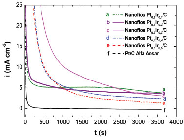 Os valores obtidos das pseudo-densidades de corrente de equilíbrio ao final de 3600 s para os eletrocatalisadores de Pt0,9Ir0,1/C; Pt0,8Ir0,2/C; Pt0,7Ir0,3/C; Pt0,6Ir0,4/C; Pt0,5Ir0,5/C e Pt/C Alfa Aesar durante a oxidação de etanol foram: 3,83; 3,62; 3,10; 2,47; 1,43 e -0,13 mA cm-2, respectivamente. Constatando-se que os eletrocatalisadores sintetizados apresentaram um rendimento superior à Pt/C comercial (Alfa Aesar). Resultados semelhantes foram obtidos por Ayoub et al.,37 e Spinacé et al.38 A capacidade anti-envenenamento dos eletrocatalisadores é um importante parâmetro a ser abordado antes da utilização em aplicações comerciais. Os eletrocatalisadores sintetizados neste estudo se mostraram eficientes frente à oxidação de etanol quando comparados com a Pt/C da Alfa Aesar. Antes da reação catalítica, os locais eletroquimicamente ativos são acessíveis para a adsorção das moléculas de etanol. Posteriormente, a adsorção de novas moléculas dependeria dos locais ativos liberados ocupados pelas espécies intermediárias do tipo CO geradas no processo de oxidação de etanol, afetando eventualmente a cinética da eletrocatálise.