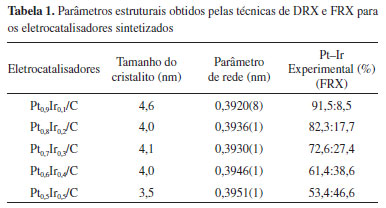 PROCEDIMENTO EXPERIMENTAL O substrato utilizado na síntese dos nanofios de Pt-Ir foi o carbono (Vulcan® XC72). O ácido hexacloroplatínico (H2PtCl6.6H2O - Sigma-Aldrich®, 37,5% de Pt) e cloreto de irídio hidratado (IrCl3.xH2O - Sigma-Aldrich®) foram utilizados como precursores metálicos. Os nanofios (20% de carga metálica) e diferentes composições entre Pt e Ir foram sintetizados de acordo com o método de redução química.19 O ácido fórmico (Vetec, 98-100% de pureza) foi utilizado como agente redutor. Todos os experimentos foram realizados a temperatura ambiente (25 ºC) em solução aquosa e na ausência de surfactantes. Para o crescimento dos catalisadores Pt-Ir no substrato de carbono, o IrCl3.xH2O foi dissolvido em água ultrapura obtida por um sistema Gehaka modelo MS 2000, para posterior adição do H2PtCl6.6H2O. Em seguida, uma quantidade de carbono (Vulcan® XC72) foi adicionado sob agitação de 100 rpm por 30 min e por último o ácido fórmico (HCOOH, Vetec, 98-100% de pureza) foi inserido como agente redutor dos íons metálicos sobre o substrato de carbono. A solução ficou armazenada por 72 h a temperatura ambiente. Após esse tempo o sólido resultante foi filtrado e lavado várias vezes com água ultrapura com o auxílio de uma bomba a vácuo modelo PRISMATEC 131, utilizando membrana em ésteres de celulose (com poros de 47 µm) da Millipore. Posteriormente levado à estufa para secagem a 60 ºC por 30 min. As análises de MET foram realizadas utilizando um microscópio eletrônico JEOL 2100 HTP JEM em 200 kV. As medidas de DRX foram realizadas utilizando um difratômetro (PANalytical EMPYREAN) com geometria Bragg-Bretano, com detector PIXcel1d, operando com radiação Cu Kα (λ = 0.15406 nm) e com aplicação de tensão e corrente, respectivamente, de 40 kV e 40 mA. Os parâmetros utilizados (varredura angular 2θ = 20º-90º, com passo de 0,5o min-1 foram mantidos constantes durante todas as análises. Todos os padrões de difração foram analisados utilizando o programa Philips X'pertHighScore Plus e o banco de dados cristalográfico JCPDS. O refinamento Rietveld foi realizado em todas medidas de difração de raios X, considerando apenas a fração cristalizada, a fase da nanoliga. Para isso foi utilizado o programa DBWS 9807 conforme implementado na interface DBWSTools2.3.23 As análises eletroquímicas foram realizadas em um potenciostato/galvanostato modelo Autolab PGSTAT302N acoplado a um computador. Os perfis voltamétricos dos diferentes eletrocatalisadores foram obtidos em uma célula eletroquímica de um compartimento com o corpo confeccionado em vidro Pirex®, contendo um eletrodo de referência de hidrogênio preparado na mesma solução (EHMS), um contra eletrodo de platina de 1 cm2 e o eletrodo de carbono vítreo. Os experimentos foram realizados em solução ácida de H2SO4 0,5 mol L−1 saturada com nitrogênio (N2). O eletrodo de trabalho para cada teste foi preparado a partir de uma camada ultrafina de suspensão sobre um eletrodo de carbono vítreo. Para isso, foi utilizada uma suspensão contendo 0,0032 g do catalisador, 1000 µL de álcool isopropílico (Sigma-Aldrich®) e 30 µL de náfion em solução (Aldrich Chemical, solução a 0,05 wt% em álcoois alifáticos). A mistura resultante foi levada ao banho de ultrassom (Ultracleaner 1450 A) até se tornar homogênea e, em seguida, uma camada de 5 µL foi depositada no eletrodo de carbono vítreo. Em seguida seco ao ar ambiente e hidratado com água ultrapura durante 1 min, obtendo-se assim um filme fino de catalisador. Todos os potenciais dos eletrodos de trabalho obtidos foram referenciados ao EHMS. Os testes de atividades catalíticas para a eletrooxidação de etanol foram realizados em meio ácido (H2SO4) 0,5 mol L-1 saturado com nitrogênio (N2) e a uma velocidade de varredura de 20 mV s−1. As análises da eletrooxidação de etanol foram comparadas com a Pt/C da Alfa Aesar. Todas as análises foram realizadas em triplicata e com um volume da célula eletroquímica de 64 mL. Para o cálculo da área eletroativa, utilizou-se a área abaixo do pico de oxidação de CO, pois a oxidação de uma monocamada de CO linearmente adsorvida na Pt24 envolve uma carga de 420 µC cm-2 e a oxidação de uma monocamada de CO em Ir25 gera uma densidade de carga de 287,7 µC cm-2. Todos os resultados eletroquímicos reportados neste trabalho foram normalizados pela área eletroativa calculada a partir da voltametria de desorção de CO e referenciados usando o EHMS.