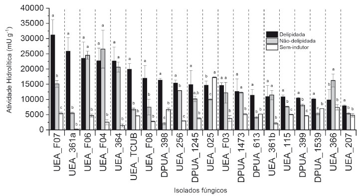 ![]() Figura 1. Testes ANOVA de igualdade entre as médias e pós-teste de Tukey da atividade hidrolítica das biomassas delipidada, não-delipidada e crescida em meio sem indutor, de vinte isolados fúngicos. Os testes foram aplicados para as médias dos tratamentos da biomassa de cada isolado fúngico separadamente. Letras iguais entre as médias dos tratamentos de um mesmo isolado representam valores iguais para um nível de significância de 5%. Letras iguais entre médias dos tratamentos de isolados diferentes não implicam em valores estatisticamente iguais