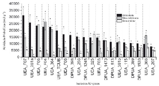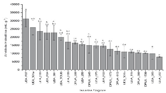![]() Figura 2. Testes de igualdade entre as médias da atividade hidrolítica da biomassas delipidada de vinte isolado fúngicos. Letras iguais entre as médias representam valores iguais para um nível de significância de 5%