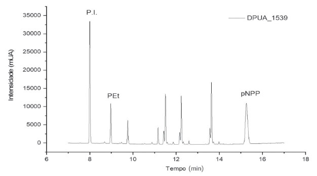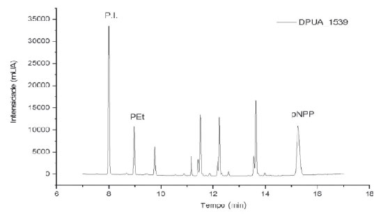 ![]() Figura 3. Cromatograma da transesterificação biocatalisada pelo isolado DPUA_1539, indicando os picos correspondentes ao padrão interno palmitato de metila (PI), ao produto (PEt) e ao reagente limitante (pNPP)