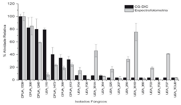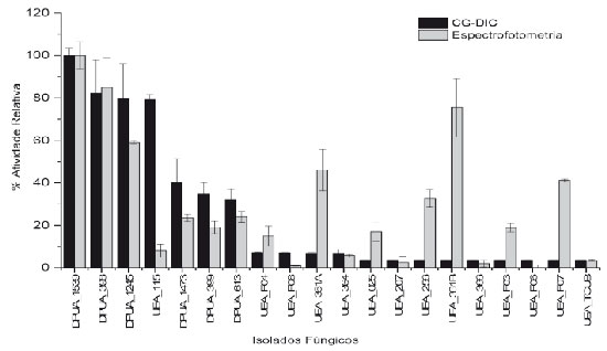 ![]() Figura 4. Atividade sintética relativa do isolados fúngicos, calculada a partir da atividade específica determinada por CG-DIC e por espectrofotometria