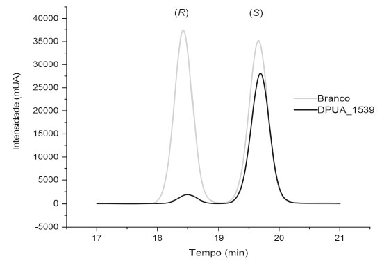 ![]() Figura 5. Enantiopreferência pelo (R)-enantiômero na reação de esterificação do ibuprofeno racêmico biocatalisada pelo isolado DPUA_1539 A. flavo-furcatis, após 96h de reação