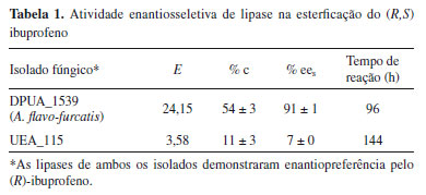 O isolado DPUA_1539 A. flavo-furcatis apresentou os valores absolutos mais altos de atividade específica na formação de ambos os produtos, a saber, 668,5±23,5 mU g-1 para a formação PEt e 600,5±39,4 mU g-1 para o pNP. Os percentuais de conversão foram respectivamente 10% e 9%. Por essa razão, este isolado foi escolhido para ser o padrão de referência, equivalente a 100% de atividade relativa em ambas as metodologias. Verificou-se que, para 14 isolados, a diferença entre as atividades relativas foi inferior a 21%. Dentre estes isolados, os cinco com menores percentuais calculados segundo a espectrofotometria (menos que 5%) também apresentaram baixos percentuais de acordo com cromatografia gasosa (menos que 10%). Esses resultados indicam uma razoável concordância entre as duas metodologias de determinação da atividade enzimática. Uma exceção notável foi o isolado UEA_115, com apenas 8% de atividade de acordo com a espectrofotometria, mas 79,2% de atividade segundo a cromatografia gasosa. Por outro lado, os isolados UEA_361a, UEA_361b, UEA_256 e UEA_F07 apresentaram percentuais expressivos segundo a espectrofotometria (acima de 30%) e percentuais muitos baixos de acordo com a cromatografia gasosa (menos de 4%). A transesterificação é a reação central na produção de biodiesel - um dos tópicos de maior relevância para a biocatálise nestas primeiras décadas do século XXI. Ensaios de transesterificação biocatalisada de triacilgliceróis para a obtenção de biodiesel tipicamente duram muitas horas ou mesmo dias. Assim, na prospecção de novas enzimas microbianas para utilização na produção de biodiesel, um ensaio de baixo custo que permita verificar de forma rápida e precisa a capacidade de transesterificação é de grande utilidade. O ensaio de transesterificação do pNPP com etanol, proposto por Teng e Xu,26 tem como pontos altos o baixo custo e a rapidez na verificação do resultado. Entretanto, a comparação dos resultados obtidos em nosso trabalho, levando em conta a maior sensibilidade e robustez da quantificação de produtos via CG-DIC, sugere que o ensaio espectrofotométrico de Teng e Xu é suscetível a resultados falsos positivos. A literatura indica que p-nitrofenol ésteres podem eventualmente sofrer hidrólise não-enzimática.37 No caso de enzimas não-purificadas, é preciso levar em conta a possibilidade de que compostos provenientes do meio de cultivo ou da matriz celular possam interferir na leitura da absorbância. Mesmo o processo de delipidação empregado neste trabalho pode não remover por completo estes interferentes. Ainda assim, a relativa concordância entre as metodologias sugere que o ensaio espectrofotométrico pode ser empregado como triagem preliminar, qualitativa, visando eliminar da seleção as linhagens menos promissoras. Os resultados mostrados na Figura 4 também permitem verificar que as linhagens de Aspergillus tiveram seis dos sete resultados mais altos de atividade sintética avaliada pela formação de PEt. De fato, diversos estudos relacionados à síntese de ésteres e ao biodiesel empregaram lipases ligadas ao micélio deste gênero de fungo.25,33,34,38,39 Romero et al.39 e Colin et al.34 avaliaram a atividade sintética das lipases ligadas ao micélio de A. niger MYA 135 pela transesterificação entre pNPP e etanol, mensurada pela liberação do pNP detectada a 405 nm. Usando micélio lavado superficialmente com acetona e centrifugado, Romero et al. obtiveram como melhor resultado 69,4±9,4 mU g-1. Empregando micélio que fora apenas centrifugado, Colin et al. relataram com melhor atividade o valor de 59,3±3,8 mU g-1. Como comparação, em nosso estudo a atividade sintética da biomassa delipidada de A. niger DPUA_398 deteminada pelo método espectrofotométrico foi expressivamente superior, sendo de 510,1±83,6 mU g-1. A cromatografia gasosa apresentou um valor de atividade semelhante para este isolado (549,7±105,8 mU g-1). Avaliação da enantiosseletividade Os isolados DPUA_1245, UEA_364 e UEA_366 não foram testados nesta etapa por não terem produzido massa micelial suficiente para utilização na reações. Assim, verificou-se a atividade enantiosseletiva de lipases de dezessete isolados fúngicos através da resolução do ibuprofeno racêmico pela esterificação com 1-propanol em isooctano. Dois destes isolados apresentaram atividade enantioseletiva. A Tabela 1 apresenta os melhores resultados obtidos com estes fungos.