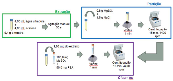 PARTE EXPERIMENTAL Reagentes e insumos Os solventes empregados para a determinação cromatográfica foram metanol grau HPLC (99,99%, JTBaker®), acetona grau HPLC (99,9%, Panreac®) e água ultrapura obtida por osmose reversa e posteriormente deionizada (18,2 MΩ cm, Millipore-Simplicity UV, Bedford, MA, USA). Filtros de membrana Whatman® acetato de celulose ME 25/21 ST 0,45 µm, Ø=47 mm, foram empregados na etapa final do preparo de amostras, antes da injeção delas no sistema cromatográfico. Os padrões de alta pureza ( ≥ 99,0%) dos conservantes utilizados são de procedência Sigma-Aldrich®, sendo eles: 2-Fenoxietanol (FE), 4-hidroxibenzoato de metilo (MP), 4-hidroxibenzoato de propilo (PP). Equipamentos As análises cromatográficas em fase líquida foram realizadas em equipamento Agilent 1260 Infinity, equipado com detector de arranjo de diodos (DAD), coluna C18 (ZORBAX Eclipse, 50 × 4,6 mm, 5 µm), pré-coluna C18 de mesma marca e software OpenLAB® CDS (EZChrom edition) versão A.04.05. As pesagens foram efetuadas em balança analítica digital OHAUS® Adventurer Pro AV264P (± 0,1 mg) e balança analítica Mettler-Toledo® XS205DU com precisão de ± 0,01 mg. A agitação das amostras for realizada em vortex B. Braun® Biotech International Certomat MV, e a centrifugação em centrífuga Eppendorf® 5702. Preparo das soluções estoque Foram preparadas soluções estoque de cada um dos analitos na concentração de 1000 mg L-1 em metanol grau HPLC, pesando-se 10,00 mg dos padrões em balança analítica Mettler-Toledo XS205DU, e diluindo-os em 10,00 mL de metanol grau HPLC. Estes padrões foram mantidos ao abrigo da luz e sob refrigeração a -4 ºC. Método de fortificação das amostras A partir das soluções estoque foram preparadas, com auxílio de micropipetas e balões volumétricos, soluções contendo concentrações intermediárias através de diluição em metanol, que posteriormente foram utilizadas para preparar as soluções trabalho diluídas em fase móvel. A partir dessas soluções de trabalho, com auxílio de micropipetas, as amostras foram fortificadas visando atingir a concentração desejada, e posteriormente homogeneizadas durante 1 minuto em um agitador Vortex. Método baseado em QuEChERS Objetivando a extração dos conservantes e o clean up das amostras, estabeleceu-se um método baseado em QuEChERS para o preparo de amostra. A etapa de otimização do procedimento QuEChERS consistiu na avaliação univariada dos parâmetros solvente de extração (acetonitrila, metanol, acetona, acetronitrila/acetona e acetonitrila/metanol) e de sorvente de clean up (PSA, C18, Florisil®, C18+PSA e C18+Florisil®). Os parâmetros foram avaliados pelos valores de recuperação e pelo coeficiente de variação na análise de 3 cosméticos isentos dos conservantes de interesse, sendo um gel de limpeza, um creme hidratante e um sabonete líquido, que foram fortificados com soluções padrão conforme descrito anteriormente. Para o desenvolvimento do método cromatográfico foi utilizado um gel de limpeza facial comercial isento dos analitos de interesse (amostra branco). Essa amostra foi fortificada com soluções padrão conforme descrito anteriormente. A etapa de extração consistiu em pesar 100 mg de amostra em um tubo cônico de polipropileno de 15 mL, onde então foi adicionado 4,00 mL de água ultrapura e 4,00 mL de acetona (solvente extrator), após homogeneização por agitação manual por 30 segundos, foi adicionado uma mistura de sais (0,8 g de MgSO4 e 1,5 g NaCl) e seguiu-se então agitação em vortex por 1 min e centrifugação por 15 min a 4400 rpm. Na etapa de clean up, 1,00 mL do extrato obtido anteriormente foi transferido para outro tubo cônico de polipropileno de 15 mL contendo 100,0 mg de MgSO4 e 50,0 mg de sorvente amina primária-secundária (PSA), então o tubo foi agitado em vortex por 1 min e seguiu para centrifugação por 15 min a 4400 rpm. Após a etapa de limpeza, uma alíquota de 250 µL do extrato foi transferido para um vial de 2 mL, seco sob gás nitrogênio (N2), e então o extrato seco foi reconstituído em fase móvel (35% MeOH e 65% H2O) até o volume de 1,00 mL. Uma alíquota de 200 µL foi transferida para outro vial de 2,0 mL e diluída até o volume de 1,00 mL. As amostras foram filtradas em filtros de acetato de celulose de 0,45 µm, e seguiram para injeção no sistema HPLC-DAD. O procedimento está ilustrado na Figura 1.