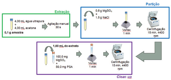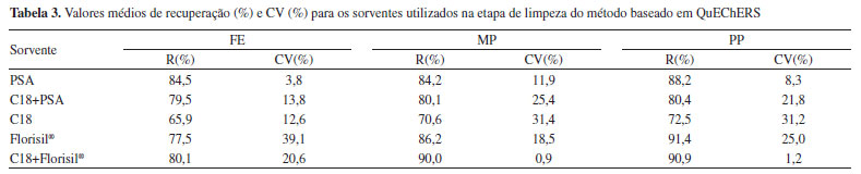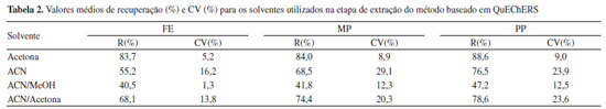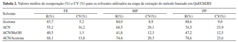 Apesar do método QuEChERS original utilizar acetonitrila como solvente de extração, foi escolhido a acetona como solvente extrator com base nos resultados obtidos, pois forneceu os melhores valores de recuperação, e os menores valores de coeficiente de variação para todos os analitos. Além disso, acetona é facilmente volatilizada sob fluxo de N2, o que representa uma vantagem adicional do seu uso. Na Tabela 3 são mostrados os resultados em relação ao estudo para a escolha do sorvente da etapa de clean up. Foram avaliados os sorventes PSA, C18 e Florisil®, além da combinação binária entre os mesmos.