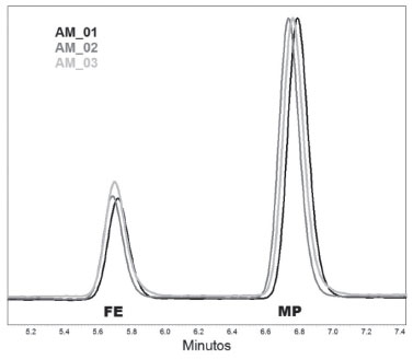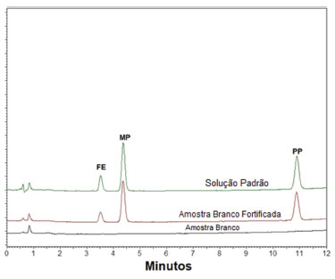 ![]() Figura 3. Cromatogramas obtidos na análise de amostra branco e amostra branco fortificada com 3,00 µg mL-1 para FE, e 1,00 µg mL-1 para MP e PP em comparação com a solução padrão dos analitos