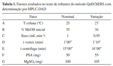 Análise cromatográfica Um modo de eluição gradiente baseado no método proposto por Zgoła-Grzeskowiak e colaboradores17 foi desenvolvido para a determinação simultânea de todos os analitos, empregando-se MeOH:água (v/v), com uma composição inicial de 35% de metanol, aumentando até 60% até 13 min, e retornando linearmente à condição inicial até 23 min. Foram injetados 50 µL de amostra, sob vazão de 1,00 mL min-1 à temperatura de 25,0 °C. Validação do método A validação do método foi realizada em termos de seletividade, linearidade, exatidão, precisão, limites de detecção e quantificação.18,19 Todos os parâmetros foram obtidos utilizando a técnica de sobreposição de matriz, utilizando-se como amostra branco um gel limpador facial comercial isento dos analitos de interesse, que foram fortificados conforme descrito anteriormente. A composição desta amostra de acordo com o fabricante, seguiu a nomenclatura dos ingredientes normatizada pelo INCI (International Nomenclature Cosmetic Ingredients), sendo a seguinte: Aqua, Sodium Laureth Sulfate, PEG-8, Coco-Betaine, Hexylene Glycol, Sodium Chloride, PEG-120 Methyl Glucose Dioleate, CI19140/Yellow 5, CI42043/Green 3, Glycerin, Glycolic Acid, Triethanolamine, Salicylic Acid, Sodium Benzoate, Sodium Hydroxide, Dipotassium Glycyrrhizate, Caprylyl Glycol, Capryloyl Salicylic Acid, Citric Acid, Butylene Glycol, Parfum. Além das informações fornecidas pelo fabricante (ingredientes e publicidade "livre de parabenos"), a análise por cromatografia líquida indicou a ausência de picos cromatográficos com tempo de retenção iguais aos conservantes estudados. Seletividade A seletividade foi avaliada pela comparação entre os cromatogramas dos extratos de amostras branco com os extratos das amostras branco fortificadas com solução padrão de MP, PP e FE na concentração de 1,0 µg mL-1 para os parabenos e 3,0 µg mL-1 para FE. Comparando-se os cromatogramas é possível verificar se há a presença de picos provenientes de substâncias interferentes na mesma região de tempo de retenção dos analitos, assim como, observar se há diferença do tempo de retenção das espécies de interesse na amostra branco em relação ao cromatograma da solução padrão do analito. Linearidade Foram avaliadas duas curvas analíticas em triplicata, uma na faixa de concentração de 0,10 a 2,50 µg mL-1 para os parabenos e outra na faixa de concentração de 1,50 a 6,00 µg mL-1 para o fenoxietanol (padrões preparados na proporção inicial da fase móvel, metanol:água 35:65 (v/v)). Os analitos foram monitorados por detecção no ultravioleta por DAD nos comprimentos de onda: 254 nm (para o MP e PP), e 270 nm (para o FE). A linearidade foi avaliada pelo coeficiente de correlação da curva analítica.17 Exatidão Os parâmetros analíticos de mérito foram avaliados seguindo as recomendações da ANVISA.19 A exatidão do método desenvolvido foi avaliada através do cálculo do fator de recuperação fortificando-se as amostras em 3 níveis de concentração (n=5), e utilizando-se a média das recuperações em cada concentração para o cálculo da exatidão. Precisão, limites de detecção (LD) e quantificação (LQ) O estudo de precisão do método desenvolvido foi feito por ensaios de repetibilidade e de precisão intermediária. As amostras foram fortificadas com solução padrão dos analitos em 3 níveis de concentrações (n=5) e a precisão foi avaliada pelo cálculo do coeficiente de variância (CV). Para cada um dos analitos, os seus respectivos limites de detecção (LD) e limites de quantificação (LQ) do método foram estimados a partir dos parâmetros de suas curvas analíticas. O LD é calculado como (3,3s)/S e o LQ como (10s)/S, sendo s o desvio do coeficiente linear da equação e S é o coeficiente angular da curva analítica.18 Robustez A robustez do método foi avaliada por meio do teste de Youden, empregando-se amostras fortificadas com solução padrão na concentração de 1,0 µg mL-1 para MP e PP, e 3,0 µg mL-1 para FE. As condições experimentais foram variadas conforme descrito na Tabela 1, realizando-se 8 ensaios em duplicata seguindo o planejamento fatorial característico do teste de Youden,18,20 utilizando-se a recuperação dos conservantes como resposta monitorada.