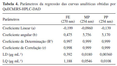 Com relação ao sistema de detecção, foram avaliados os comprimentos de onda de 254 e 270 nm. Sendo que 254 nm corresponde ao máximo de absorção para os parabenos, e é relatado na literatura o uso do comprimento de onda de 270 nm para quantificar FE.23 Os testes posteriores mostraram uma linearidade satisfatórias para esse analitos nos comprimentos de onda especificados. A linearidade foi avaliada para as curvas analíticas obtidas para cada composto de interesse, assim como a sensibilidade, que foi estimada a partir do coeficiente angular do ajuste linear das curvas obtidas. A faixa de concentração estudada foi de 0,10 a 2,50 µg mL-1 para os parabenos e de 1,50 a 6,00 µg mL-1 para o FE. Os parâmetros obtidos para as curvas de cada analito são apresentados na Tabela 4. O LD e LQ foram estabelecidos e os valores de concentração estão de acordo com a faixa linear estudada.