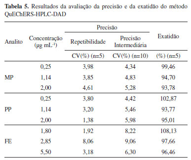 Precisão e exatidão A repetibilidade foi avaliada a partir de cinco replicatas em três níveis de concentração, enquanto que a precisão intermediária foi avaliada por meio de ensaios de repetibilidade, realizados em dias distintos. De acordo com os resultados apresentados na Tabela 5 os coeficientes de variação obtidos foram menores que 10%, estando dentro dos limites estabelecidos pela ANVISA (CV <15%).