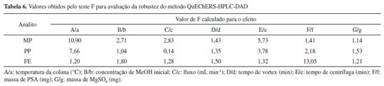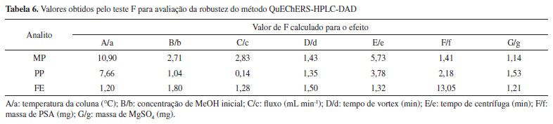 A exatidão foi avaliada em termos de fator de recuperação (Tabela 5), em ensaios envolvendo três níveis de concentração e cinco replicatas. Os valores de recuperação flutuaram entre 93,77% e 108,13%, o que se mostra concordante com o preconizado pela ANVISA (80% a 120%). Robustez A robustez do método cromatográfico foi avaliada através do teste de Youden, utilizando-se o teste de comparação das variâncias (teste F). Uma vez que os valores de Fcalculado foram maiores que os valores de Ftabelado (Ftabelado = 15,44) se admite que não há diferença significativa entre as variâncias dos ensaios na condição nominal e na condição da variação (Tabela 6), o que indica boa robustez do método. O teste de Youden também permite avaliar a significância dos efeitos provocados pelas variações deliberadamente introduzidas, observando-se, neste caso, efeitos pouco significativos.