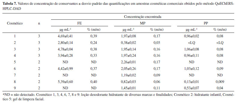 Análise de amostras cosméticas comerciais pelo método QuEChERS-HPLC-DAD Após otimização do procedimento de extração (QuEChERS) e validação do método HPLC-DAD, foram analisados 9 produtos cosméticos comerciais comprados em lojas da região de Curitiba, 8 hidratantes de diferentes marcas e finalidades (cosméticos 1, 2, 3, 4, 6, 7, 8 e 9) e 1 gel de limpeza facial (cosmético 5), sendo quatro produtos analisados em triplicata e cinco produtos analisados em duplicata. Em todos os casos, os valores de concentração encontrados estão abaixo dos limites máximos estabelecidos pela ANVISA (Tabela 7).