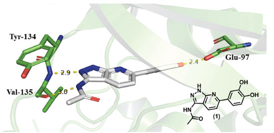 ![]() Figura 1. Interações por ligação de hidrogênio (linhas pontilhadas amarelas) observadas entre (1) (átomos de C em branco) e os resíduos de aminoácido Tyr134, Val135 e Glu97 (átomos de C em verde) da proteína cinase GSK3β (PDB: 5OY4).18 Distâncias em Å. Figura gerada com o programa PyMOL.