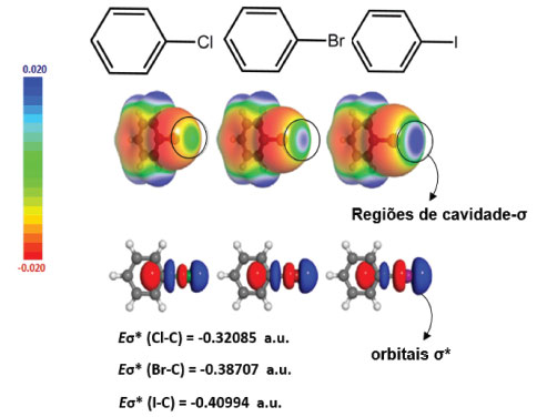 ![]() Figura 2. Regiões de cavidade-σ em halogênios, adaptado de Beno e colaboradores.20 Unidade dos mapas de potencial eletrostático em a.u (1 a.u.= 627,50 kcal/mol, 1 a.u.= 2625,5 kJ/mol). Método utilizado para geração dos mapas: B3LYP/6-311G(d).