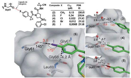 Ligações de halogênio são interações em que átomos de halogênios interagem favoravelmente através das regiões de cavidade-σ, que apresentam um potencial eletrostático relativamente positivo, com átomos ou grupos capazes de atuar como bases de Lewis.21 De acordo com definição recomendada pela IUPAC, uma ligação de halogênio típica pode ser representada pelos três pontos em R-X∙∙∙Y, em que R-X é o doador da ligação de halogênio, sendo X qualquer halogênio apresentando uma região de cavidade σ e R é um grupo ou átomo ligado covalentemente ao halogênio. Y é o aceptor da ligação de halogênio, sendo uma espécie apresentando ao menos uma região nucleofílica para interagir com o doador da interação.22 Este tipo de interação já vem sendo explorada de forma racional na busca de novos compostos que apresentem atividade biológica. Tomando como exemplo a série de compostos (2) a (5) desenvolvidos para a inibição covalente reversível da catepsina L humana (hCatL),23 é possível perceber pelos dados de CI50 que há uma estabilização da interação conforme se aumenta a massa atômica dos átomos de halogênio. A partir da análise das estruturas cristalográficas dos complexos da enzima com (3) (PDB: 2XU4), (4) (PDB: 2YJC), (5) (PDB: 2YJ2), e (6) (PDB: 2YJ8),23 isso foi relacionado com a capacidade desses compostos realizarem ligações de halogênio com o átomo de oxigênio de um resíduo de glicina (Gly61) (Figura 3).