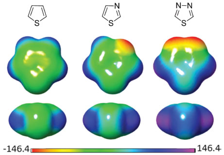 ![]() Figura 4. Regiões de cavidade-σ em átomos de enxofre presentes em anéis heterocíclicos de 5 membros. Unidade dos mapas de potencial eletrostático: kJ/mol. Método utilizado para geração dos mapas: M06-2X-D3/6-31++G**. Adaptado de ZHANG e colaboradores.26