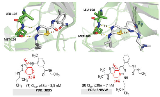 Essas interações mediadas por átomos de enxofre foram revisadas mais recentemente por BENO e colaboradores, os quais fizeram uma perspectiva sobre a aplicabilidade dessas interações para o planejamento racional de candidatos a fármacos.20 Nesse trabalho, foi destacado o potencial das interações de cavidade-σ intramoleculares na indução de estabilizações conformacionais, que podem, consequentemente, influenciar no modo de interação de compostos bioativos com os seus respectivos alvos.27,28 Isso pode ser observado claramente para (7) (PDB: 3BX5)29 e (8) (PDB: 3NWW)30 (Figura 5). Esses compostos foram desenvolvidos para a inibição da serina/treonina cinase p38α e, através da análise de seus respectivos modos de interação, foi possível deduzir que estes inibidores equipotentes alcançaram suas conformações bioativas através de interações de cavidade-σ 1,4-O∙∙∙S e 1,4-N∙∙∙S intramoleculares, que levaram à exposição dos átomos de nitrogênio dos anéis tiazólicos presentes em suas estruturas para a realização de interações por ligação de hidrogênio com o resíduo de metionina na posição 109 (Met109) característico da região do hinge dessa cinase.