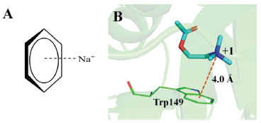 ![]() Figura 6. Exemplos de interação cátion-π: A) interação entre um benzeno e um íon Na+ B) Interação da acetilcolina com o resíduo Trp149 da subunidade a do receptor nicotínico.34 Figura gerada com os programas PyMOL e ChemDraw.