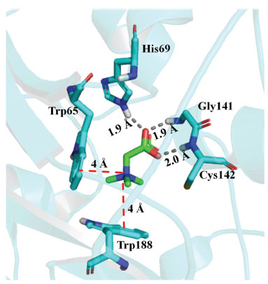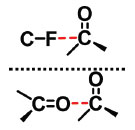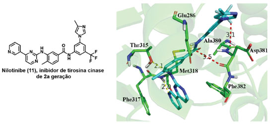 Um exemplo de interação C-F.C=O e C=O.C=O é mostrado na estrutura cristalográfica da cinase Abl humana cocristalizado com o nilotinibe (11), um inibidor de tirosina cinase de segunda geração (código PDB: 3CS9). São observadas uma interação C-F.C=O e uma C=O.C=O com distâncias de 3,1 e 3,5 Å, respectivamente, que são essenciais para a afinidade com o sítio de interação (Figura 13).45