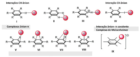 ![]() Figura 8. Possíveis modos de interação entre um ânion e um anel aromático.36 Ligações de hidrogênio não-clássicas CH-ânion (I, II, III); ligações de halogênio CX-ânion (IV); complexos ânion-π (V, VI, VII, VIII); Interações ânion-π covalente (IX); o grupo R deve ser retirador de elétrons, como átomos de flúor. (Figura gerada com o programa Chemdraw)