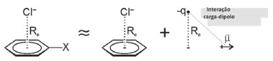 ![]() Figure 9. Modelo eletrostático dos efeitos de substituintes em complexos Cl-··· C6H6-nXn (Adaptado de Wheeler e colaboradores).38 As energias de interação de Cl- com benzenos substituídos podem ser simuladas pela adição de uma interação carga eletrostática-dipolo à interação Cl-···C6H6. Os substituintes não afetam de forma significativa uma mudança na interação do ânion com o próprio anel aromático.38 (Figura gerada com o programa Chemdraw)