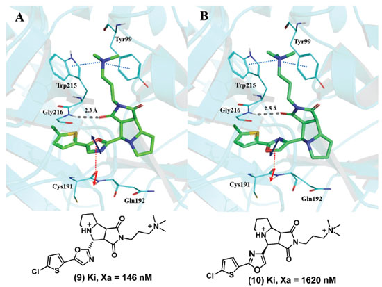 A força que resulta do empilhamento amida-π depende da orientação e da distância dos dois dipolos presentes. Estudos computacionais com o sistema N-metil-acetamida/piridina demonstraram que a energia da interação amida-π se torna progressivamente mais favorável à medida que ângulo entre os dipolos é aumentado a partir de 0º, alcançando os valores mais favoráveis entre 180º e 240º; para este mesmo sistema, a distância ótima entre os planos das duas estruturas foi de 3,4 Å.41 Um exemplo onde o empilhamento amida-π entre um anel aromático de uma proteína e um grupo amida foi importante para afinidade do ligante foi descrito no estudo que descreve o modo de interação de inibidores contendo um anel oxazola no sítio S1 do fator Xa (uma serina protease). Dois inibidores do fator Xa (9, 10) contendo um anel oxazola tiveram uma geometria de interação muito semelhante, mas como uma diferença de 11 vezes na afinidade de ligação. Essa diferença é devida à orientação dos momentos dipolares do anel oxazola e da ligação peptídica do esqueleto entre os resíduos Cys191 e Gln192 (Figura 11). Neste caso, a interação amida-π mostrou-se determinante para a potência.42