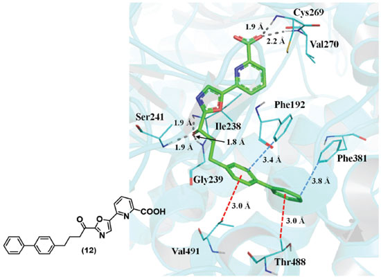 O total de energia de estabilização de cerca de 0,5-1,0 kcal mol -1 por interação é suficiente para tornar essa interação um contribuinte potencialmente importante para a estabilidade geral das proteínas, que em muitos casos não é mais do que algumas kcal/mol.47 Brandl e colaboradores descreveram que essas interações são chave em reconhecimentos que incluem a formação de complexos de proteínas com ligantes ou cofatores, como o grupo heme, piridoxal-5-fosfato, nucleotídeos, carboidratos e peptídeos ligados.46,47 Shimohigashi e colaboradores mostraram que as interações CH-π são importantes no desenho e no reconhecimento de alguns inibidores de serina proteases. 48 As interações alquila-arila entre o ligante e a proteina são importantes para estabilidade da conformação do composto α-ceto-oxazólico (12). Na estrutura cristalográfica da enzima hidrolase de amida de ácido graxo (código 3K83 no PDB), observaram-se interações CH-π entre os resíduos Val491 e Thr488 com grupos fenila do inibidor (12) (Figura 15),49 além de interações de empilhamento T (ver item a seguir) com os resíduos Phe192 e Phe381.