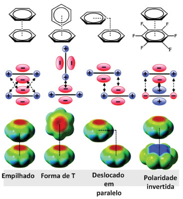 EMPILHAMENTO π O empilhamento π é uma interação de tipo dipolo-dipolo (ou, mais exatamente, quadrupolo-quadrupolo), entre anéis aromáticos e/ou hetero-aromáticos, devido à polarização das nuvens eletrônicas ou, em alguns casos, à atração eletrostática entre os elétrons π do anel aromático com carga parcial positiva σ em um átomo contido em sua estrutura.4,36 No empilhamento π, as nuvens π polarizáveis podem estar exatamente paralelas uma em relação à outra, com os átomos de cada anel envolvido localizados uns sobre os outros (empilhamento sanduíche), ou podem estar deslocadas, quando os átomos de um anel estão deslocados em relação aos do outro (empilhamento deslocado), tanto em distância quanto em ângulo, que é o modo de interação mais comum e energeticamente mais favorável (Figura 16). O ângulo entre os planos dos anéis pode chegar até 90º (empilhamento T) com uma distância de cerca de 3 a 4 Å (que poderia ser descrita também como uma interação CH (aromático) -π) (Figura 16). A energia de interação quando os sistemas π estão deslocados em paralelo ou em forma de T é de aproximadamente -2,50 kcal/mol. Quando os sistemas estão empilhados a energia de interação é menos favorável, -1,48 kcal/mol; contudo, se a polaridade é invertida, por exemplo a partir da fluoração do anel de benzeno, a interação empilhada π-π é favorecida.4,36,50