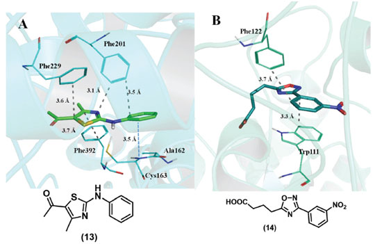 Como outro exemplo, foram observadas interações de empilhamentos π e T do grupo fenila do inibidor de aldose redutase (14) com os grupos fenila de Trp111 e Phe122, que contribuem para sua estabilidade no sítio de catalítico da enzima (Figura 17B) (PBD: 2IKG).58