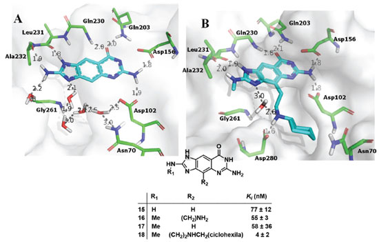 ![]() Figura 18. Exemplos de interações hidrofóbicas: A) perfil de interação do composto (15) no sítio de ligação da TGT (PDB: 2Z7K). B) Perfil de interação do composto (18) no sítio de ligação da TGT (PDB: 3EOS), cujo deslocamento de moléculas de água vistas em A aumenta a afinidade.59 Tracejado em cinza: ligações de hidrogênio. Figura gerada com o programa PyMOL.