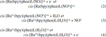 MATERIAL SUPLEMENTAR Estão disponíveis em http://quimicanova.sbq.org.br, na forma de arquivo PDF, com acesso livre, espectros eletrônicos de acompanhamento da interconversão NO+/NO2- dos compostos (Figura 1S), espectros vibracionais na região do infravermelho para os nitrosil complexos (Figura 2S), dados referentes aos deslocamentos químicos dos hidrogênios dos ligantes fenantrolina e bipiridina (Tabela 1S), espectros de ressonância magnética nuclear 2D dos compostos (Figuras 3S e 4S), representação estrutural dos compostos (Figura 5S), voltamogramas de onda quadrada (Figuras 6S e 7S) e espectros eletrônico mostrando a mudança do perfil em função da exposição à luz azul (Figura 8S).