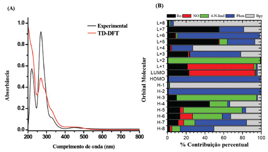 ![]() Figura 1. Espectro UV-Visível do complexo 2 em solução aquosa (A) Experimental (-) e calculado ( ). (B). Percentual de contribuição dos orbitais moleculares selecionados