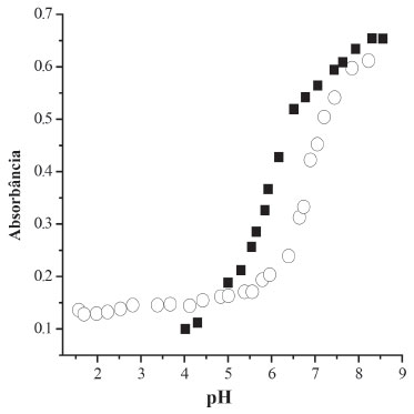 ![]() Figura 2. Titulação espectrofotométrica dos complexos cis-[Ru(bpy)(phen) (TU)NO](PF6)3 (○) e cis-[Ru(bpy)(phen)(4-N-Imd)NO](PF6)3 (■), nos lmax de 422 e 417 nm, respectivamente