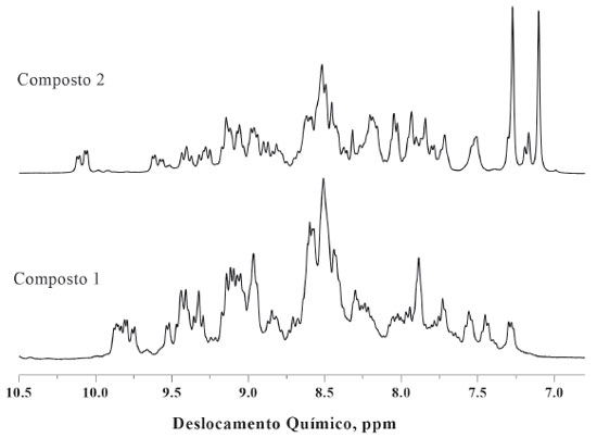 Os espectros de infravermelho para os nitrosil complexos apresentam como principal característica o estiramento NO na região entre 1926 a 1942 cm-1 (Figura 2S). Esses valores associados ao movimento vibracional deste ligante indicam que o mesmo encontra-se coordenado ao centro metálico na forma NO+.58,61-66 De acordo com a literatura, quando o NO está coordenado pela geometria linear observa-se na região do infravermelho elevadas frequências de estiramento, como consequência do menor comprimento da ligação M-N e susceptibilidade de sofrer ataques nucleofílicos.67,68 Outras bandas que se destacam nos espectros vibracionais são atribuídas ao νN-H do ligante tiouréia em 3411 e δ(NH2) em 1607 cm-1 no complexo 1 e as frequências em 3426, 1523, 1381 e 1321 cm-1 são típicas do ligante 4-nitroimidazol no complexo 2. Além dessas, verificam-se bandas em comum aos complexos associadas aos ligantes polipiridínicos, em torno de 1523-1451, 1433-1384, 716-770 e 845-558 cm-1 atribuídas aos νC=C, νC=N, δC-H e νPF6-, respectivamente.43 Para uma melhor caracterização dos nitrosil complexos, os espectros de RMN, 2D COSY e HSQC foram obtidos (Figuras 3S, 4S e 5S). A Figura 3 ilustra os espectros de hidrogênio para ambos os compostos. A presença de todos os sinais do anel N-heterocíclico (7,1 e 7,3 ppm) sugere que o ligante 4-nitroimidazol está coordenado ao centro de metal através do átomo de nitrogênio (Tabela 1S). Com base no aparecimento de 16 sinais para os átomos hidrogênio, os espectros de RMN 2D dos compostos e comportamento similar descrito para sistemas de rutênio com ligantes polipiridínicos56,69 sugerem que todos átomos de hidrogênio não são equivalentes magneticamente.