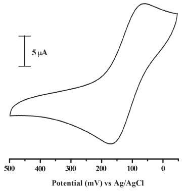 O voltamograma cíclico dos nitrosil complexos constata-se um único processo quase reversível referente ao par redox NO+/0, cujo potencial de meia-onda está em 32 mV para o complexo 1 e 117 mV para o complexo 2. A Figura 4 apresenta o voltamograma cíclico do complexo 2 em NaCF3COO 0,1 mol L-1. Ao comparar os valores de potenciais de meia-onda, observa-se que os complexos apresentam valores distintos em virtude do tipo predominante de interação (doador sigma ou receptor π) exercida pelos ligantes auxiliares L. Assim, o caráter π receptor do ligante 4-nitroimidazol no complexo 2 provoca no centro metálico uma deficiência de elétrons que enfraquece a transferência de carga do rutênio para o grupo nitrosil. Deste modo o NO experimenta uma diminuição na densidade eletrônica, a qual dificulta o processo redox. Quando o ligante coordenado é a tiouréia no complexo 1, observa-se um valor de potencial redox mais baixo devido ao maior poder σ doador deste ligante, fazendo que haja um aumento de densidade eletrônica sobre o NO. Vale ressaltar que na janela de potencial analisada não é possível observar o potencial referente ao par redox Ru3+/2+, pois ao coordenar o grupo nitrosil o valor de potencial associado ao centro metálico é observado acima de 2,0 V.68,70
