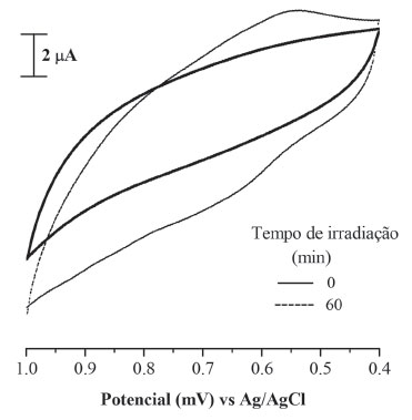 ![]() Figura 5. Voltamogramas cíclicos a 100 mV s-1 do eletrodo de carbono vítreo em solução de NaTFA 0,1 mol L 1 (pH = 3,5) contendo o composto 2 antes e depois da irradiação sob LED azul